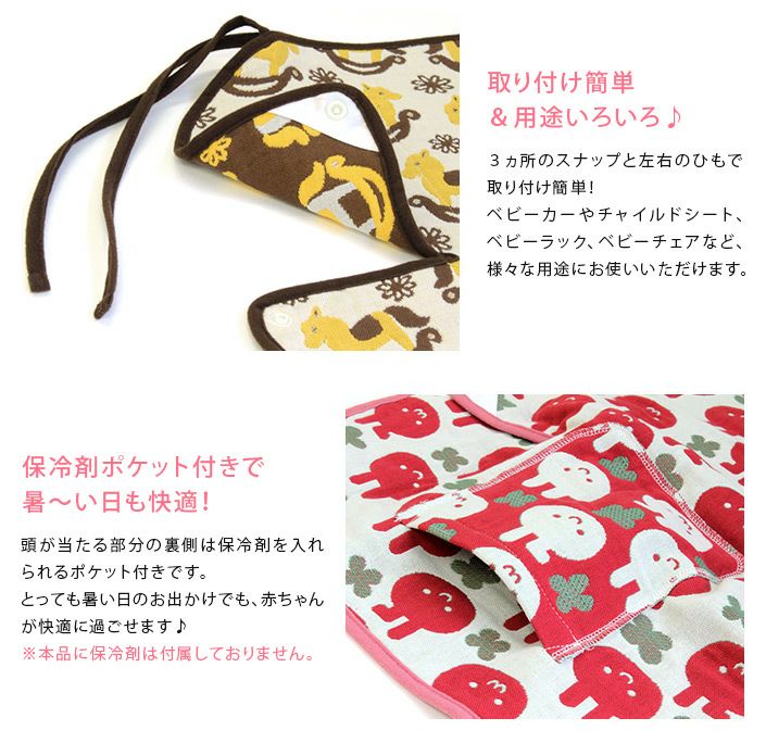 頭が当たる部分の裏側は保冷剤を入れられるポケット付きです。とっても暑い日のお出かけでも、赤ちゃんが快適に過ごせます♪