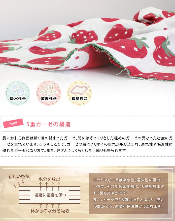 コットンガーゼは吸水性、通気性に優れています。そのため気化熱により熱も放出され、夏も爽やかです。また、ガーゼを5枚重ねることにより、空気の層ができ、適度な保温性がうまれます。