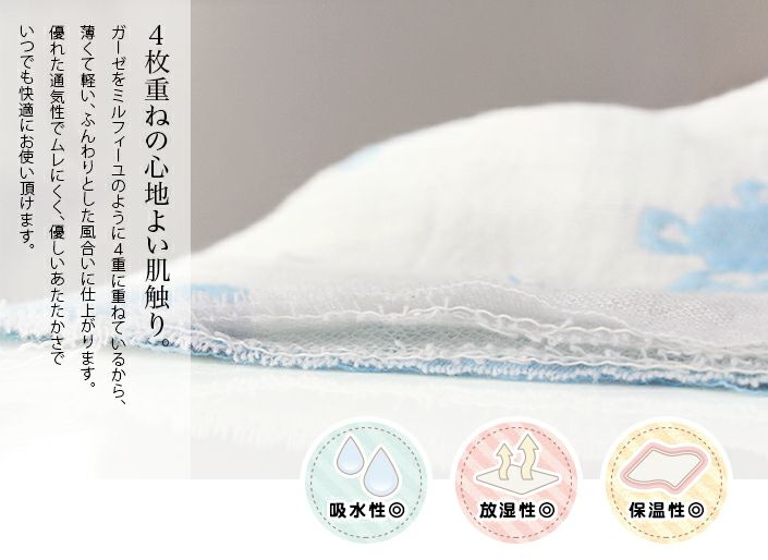 和泉山脈の天然水で晒しを行うことで生まれる、抜群の吸水性と肌なじみの良い柔らかさが特長です。