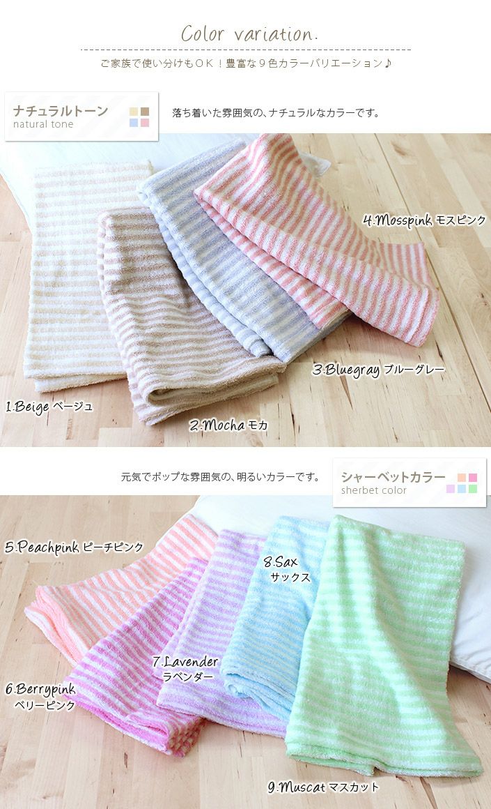 ハンドタオル、フェイスタオル、バスタオル、バスタオル代わりに使えるビッグフェイスタオル&ミニバスタオルの5サイズ展開。