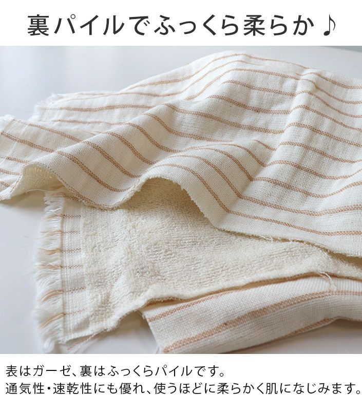和泉山脈の天然水で晒しを行うことで生まれる、抜群の吸水性と肌なじみの良い柔らかさが特長です。