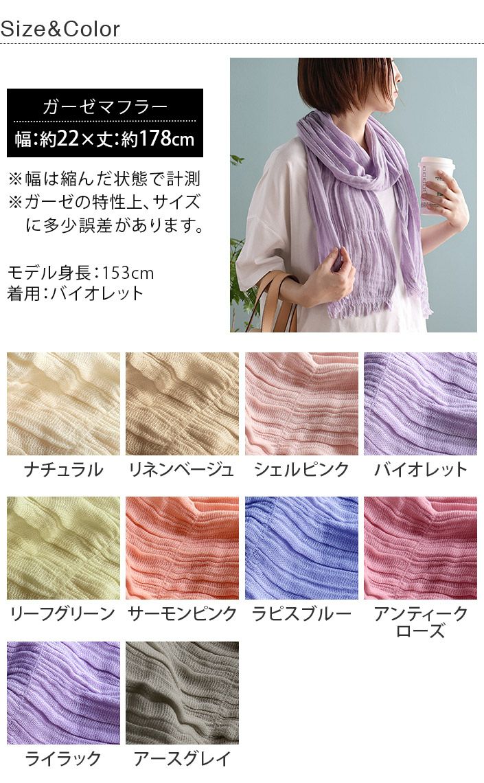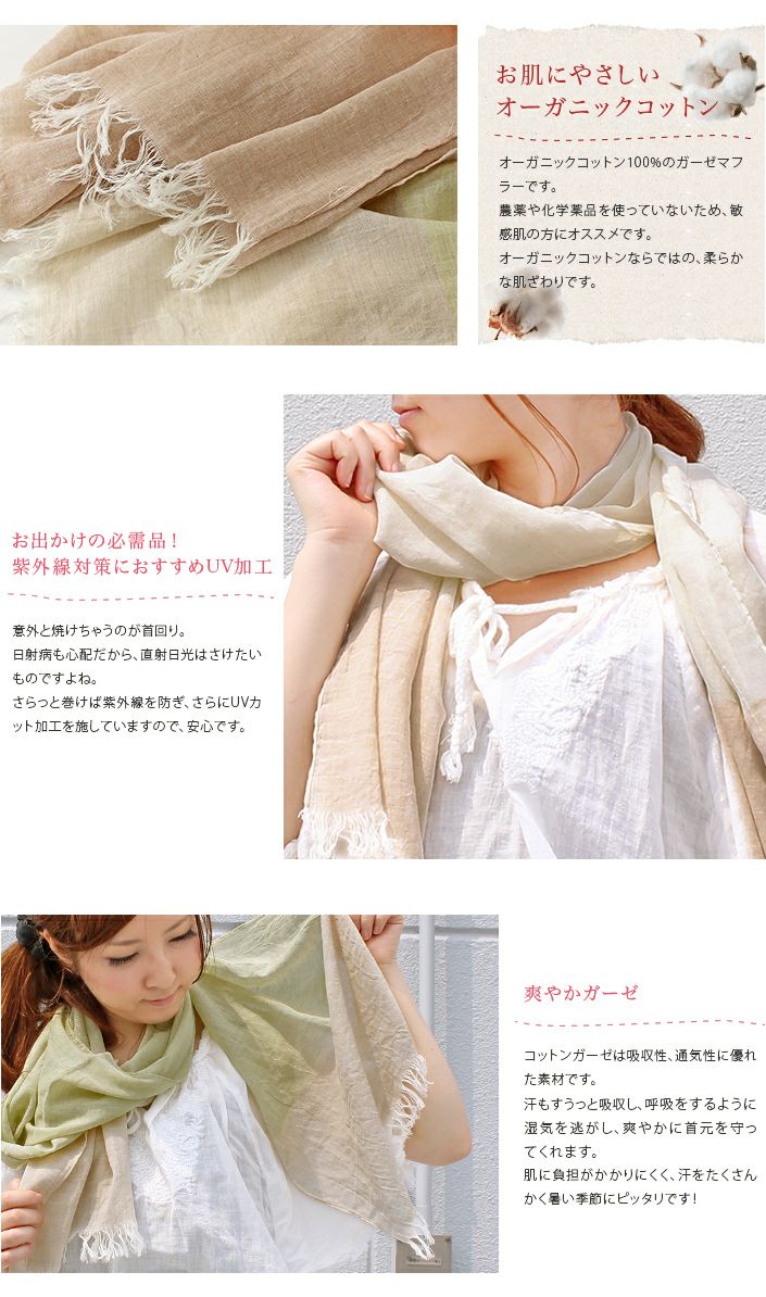 紫外線や冷房対策に UVカット加工!ガーゼマフラー UVカット コットン ガーゼマフラー 紫外線対策