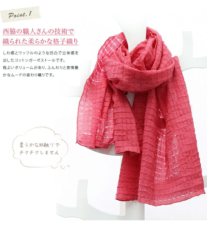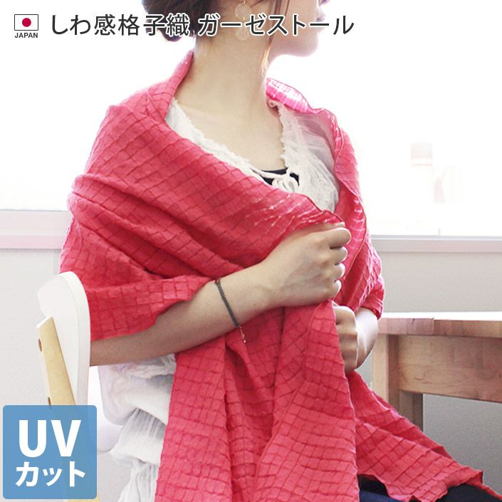ふんわり柔らかい、西脇産コットンガーゼのストール UVカット しわ感格子織 ガーゼ ストール