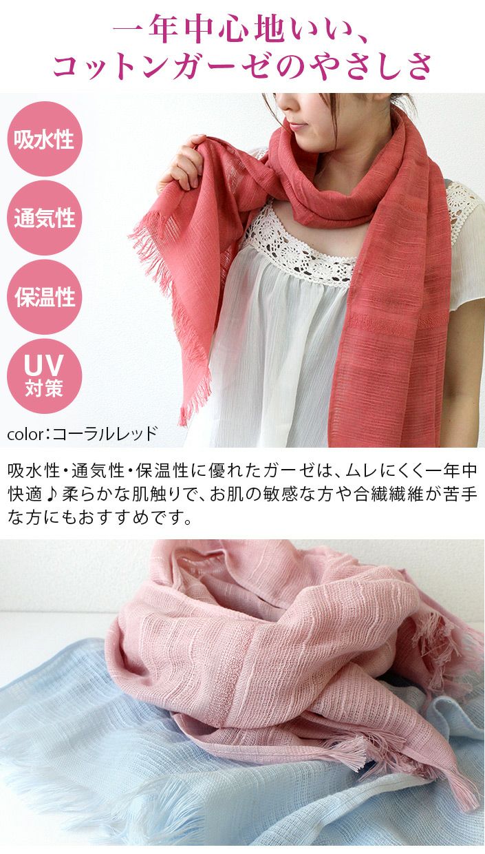 紫外線対策にもおすすめ! コットン ガーゼマフラー ロング丈
