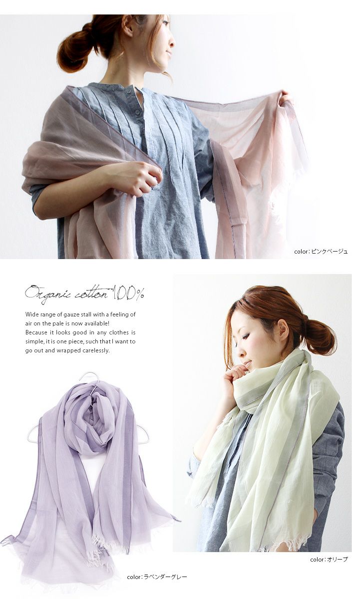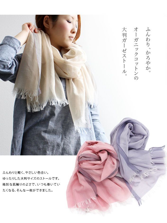 ゆったり大判、淡く柔らかなオーガニックストール UVカット オーガニックコットン 大判ガーゼストール