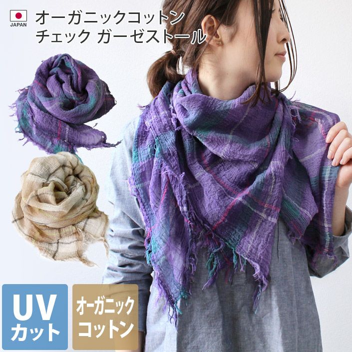 日本製 オーガニックコットン チェックガーゼストール 日本製 UVカット オーガニックコットン チェック ガーゼストール