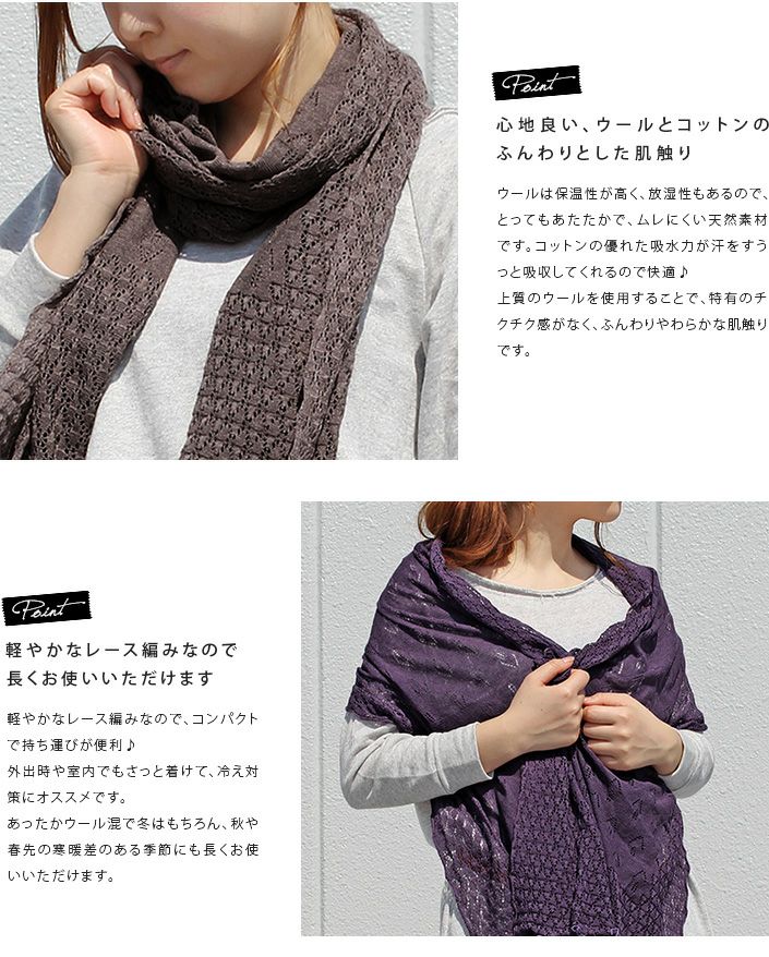 柔らかなウールコットンストール 日本製 レース編みウールコットンストール