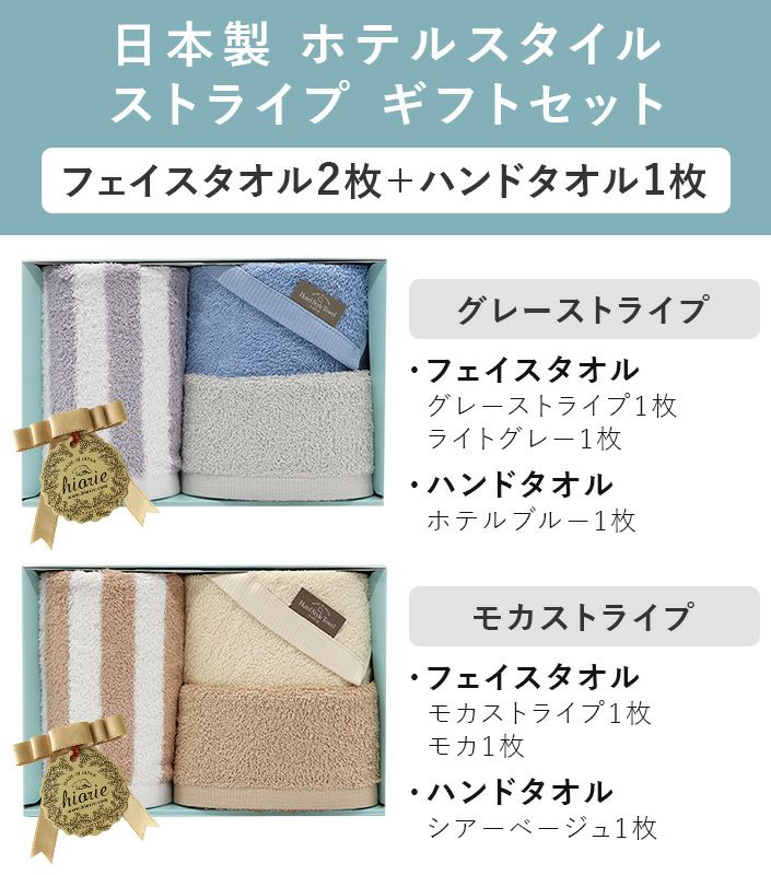 タオル直販店ヒオリエのギフト。お世話になっているあの人へ、日本製の心地良さを。どなたに贈っても喜ばれる高品質のこだわりタオルギフト「今治タオルギフト」、ポスト投函でお届けするカジュアルなギフト「メール便ギフト」、対象アイテムにお名前やイニシャルを無料で刺繍可能な「名入れ刺繍アイテム」など、さまざまな気持ちやシーンに合わせたとっておきのタオルギフトを取り揃えました。お誕生日プレゼント、出産祝い、内祝い、お中元、お歳暮、プチギフトなどでぜひご利用ください。ギフトセット以外にも、お好きな商品を自由に選べるギフトボックス&ラッピングもご用意しております。