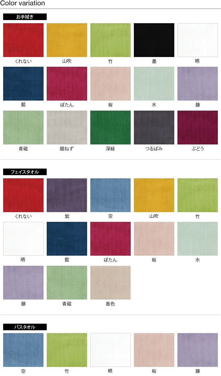 ハンドタオル、フェイスタオル、バスタオル、バスタオル代わりに使えるビッグフェイスタオル&ミニバスタオルの5サイズ展開。