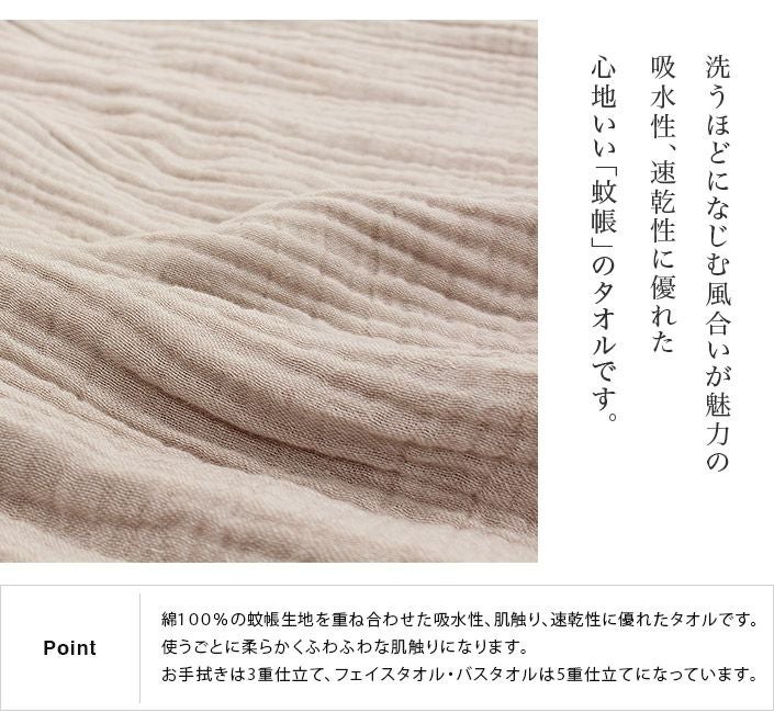 和泉山脈の天然水で晒しを行うことで生まれる、抜群の吸水性と肌なじみの良い柔らかさが特長です。