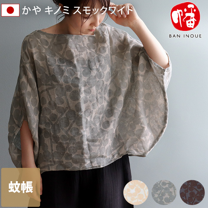 2重仕立ての蚊帳生地を使った、ドルマン袖の幅広なデザインのスモックです。キノミ柄のプリント部分は縮みにくく、ハリ感が残るので、無地の蚊帳生地と違った表情が楽しめます。