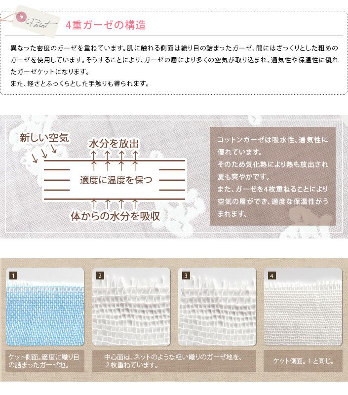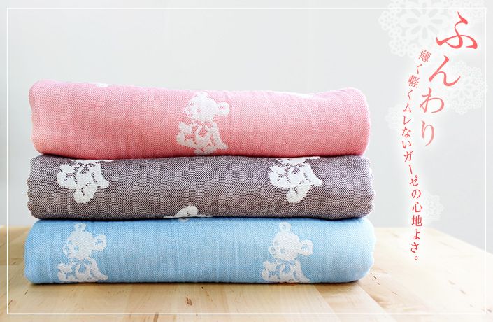 和泉山脈の天然水で晒しを行うことで生まれる、抜群の吸水性と肌なじみの良い柔らかさが特長です。