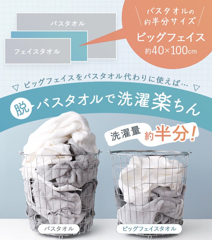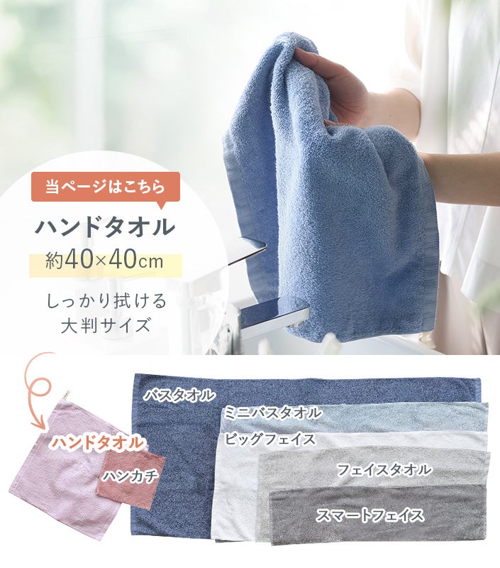 ハンドタオル、フェイスタオル、バスタオル、バスタオル代わりに使えるビッグフェイスタオル&ミニバスタオルの5サイズ展開。