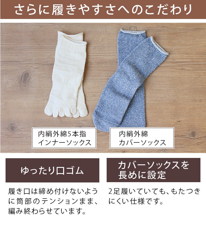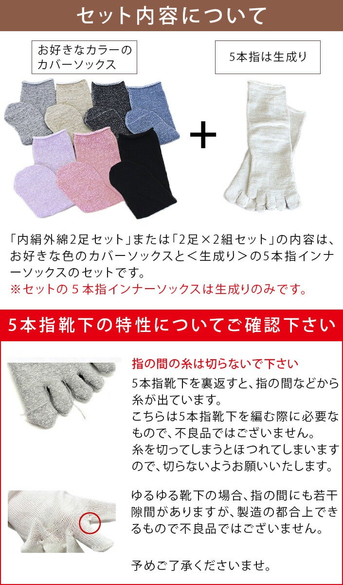 お出かけにもぴったり♪ゆったりフィットタイプの内絹外綿冷えとり靴下 (送料無料)<同色2足セット>冷えとり 内絹外綿 5本指 ミドル丈 シルクソックス