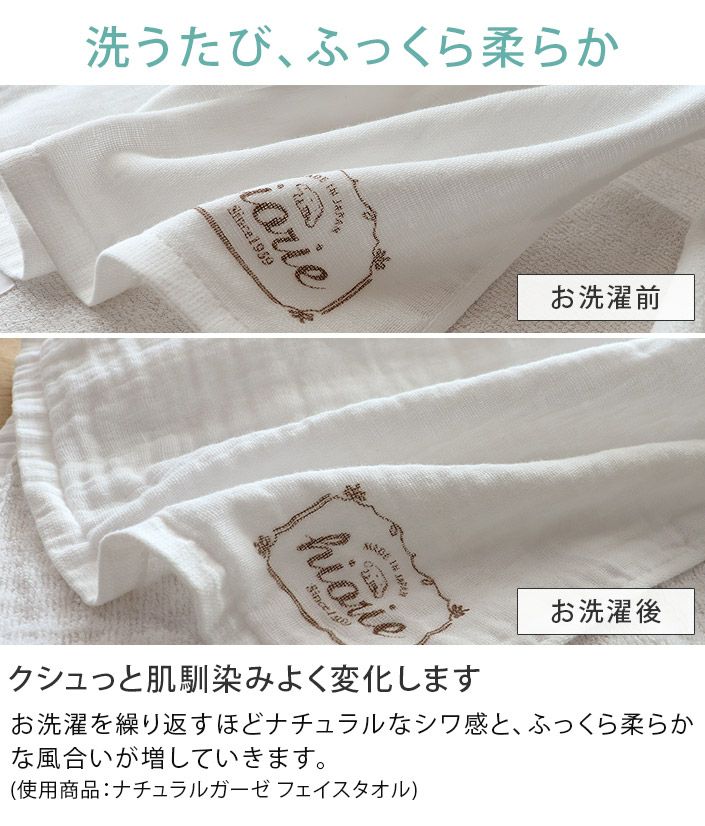 和泉山脈の天然水で晒しを行うことで生まれる、抜群の吸水性と肌なじみの良い柔らかさが特長です。