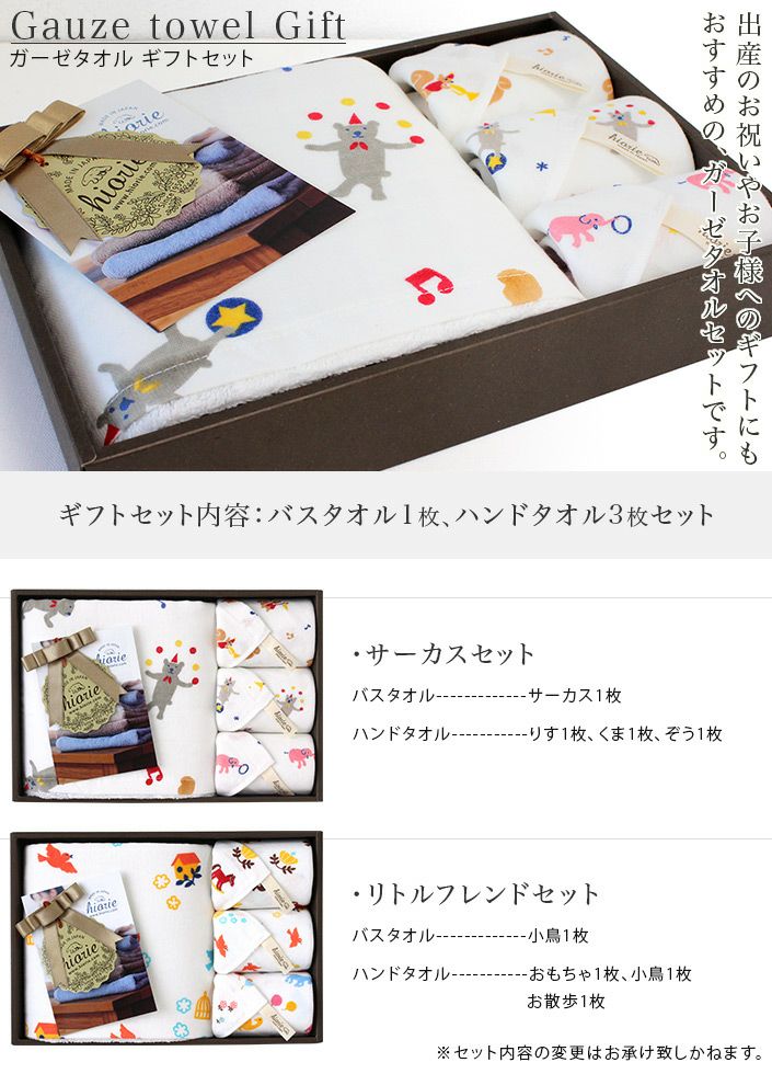 タオル直販店ヒオリエのサーカス柄タオル。毎日使いにうれしい乾きの早さと、やさしい肌触りが人気のガーゼタオル。表はさらっとガーゼ、裏はふんわりパイルの薄手タオルは、普通のタオルより乾きが速く、収納時もかさばりません。「サーカス柄 ガーゼタオル」は、かわいいサーカス柄で赤ちゃん用のシーツやガーゼケットの代わりとしてお使いの方も多いタオルです。ハンドタオルは便利なループ付き。バスタオル、フェイスタオル、ハンドタオルを取り揃えています。肌に優しいガーゼタオルは出産祝いや、ちょっとしたご挨拶やプレゼントにもおすすめです。