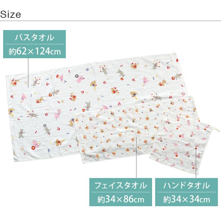 表はガーゼ、裏はパイルのさらふわ感 <同色2枚セット>ガーゼタオル バスタオル サーカス柄