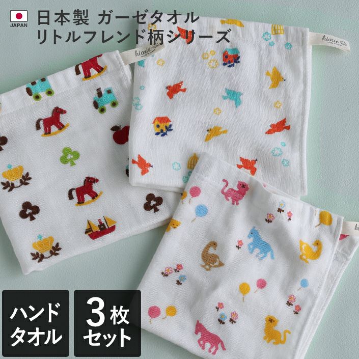 表はガーゼ、裏はパイルのさらふわ感 <3柄セット> リトルフレンド柄 ガーゼタオル ハンドタオル