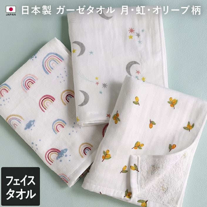 ナチュラルで可愛いデザイン 日本製 ガーゼタオル フェイスタオル 月・虹・オリーブ柄