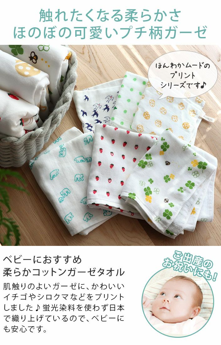 肌触りのよいガーゼに、かわいいイチゴやシロクマなどをプリントしました♪蛍光染料を使わず日本で織り上げているので、ベビーにも安心です。