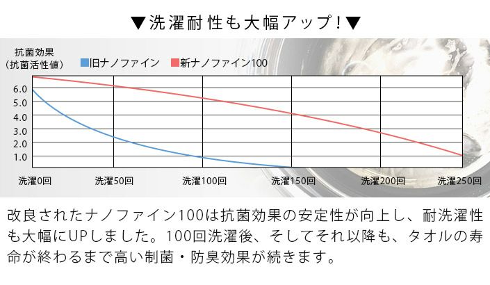 改良されたナノファイン100は抗菌効果の安定性が向上し、耐洗濯性も大幅にUPしました。100回洗濯後、そしてそれ以降も、タオルの寿命が終わるまで高い制菌・防臭効果が続きます。