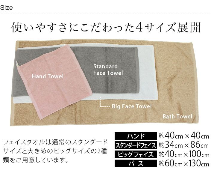 使いやすさにこだわった4サイズ展開。フェイスタオルは通常のスタンダードサイズと大きめのビッグサイズの2種類をご用意しています。