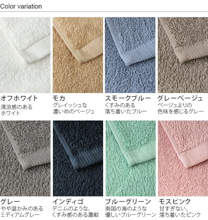 ハンドタオル、フェイスタオル、バスタオル、バスタオル代わりに使えるビッグフェイスタオル&ミニバスタオルの5サイズ展開。