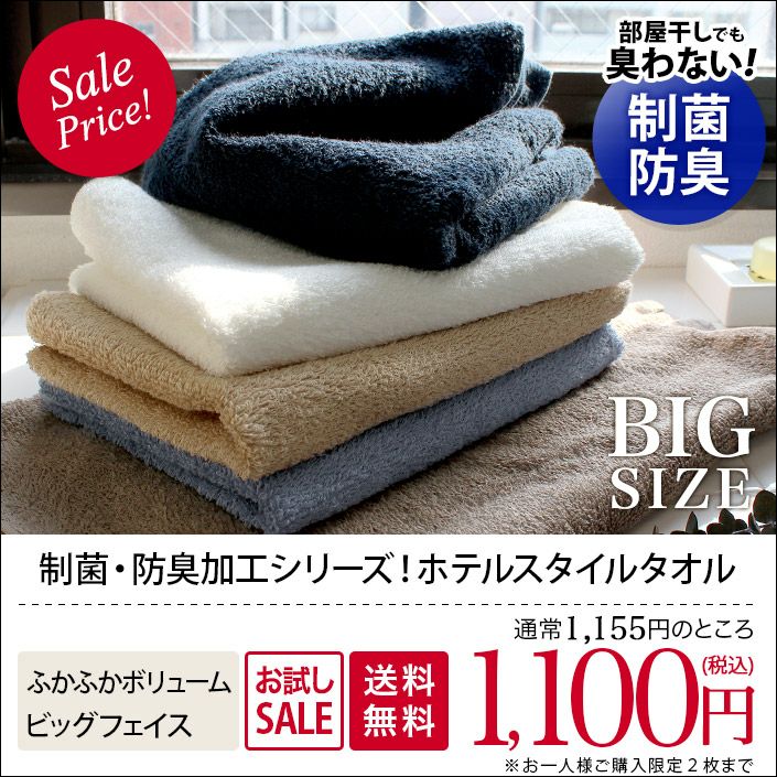 お肌にやさしくお部屋干しでも臭わない衛生的なタオル (送料無料)お試し 【制菌防臭】ホテルスタイルタオル ビッグ フェイスタオル 大きな100cm丈<おひとり様2枚まで>