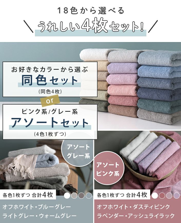 ハンドタオル、フェイスタオル、バスタオル、バスタオル代わりに使えるビッグフェイスタオル&ミニバスタオルの5サイズ展開。
