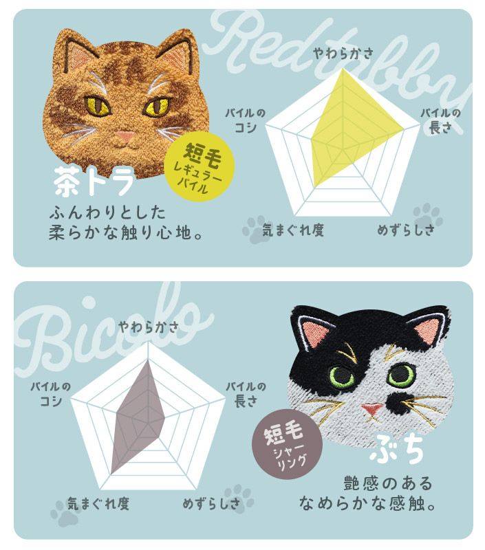 ハンドタオル、フェイスタオル、バスタオル、バスタオル代わりに使えるビッグフェイスタオル&ミニバスタオルの5サイズ展開。