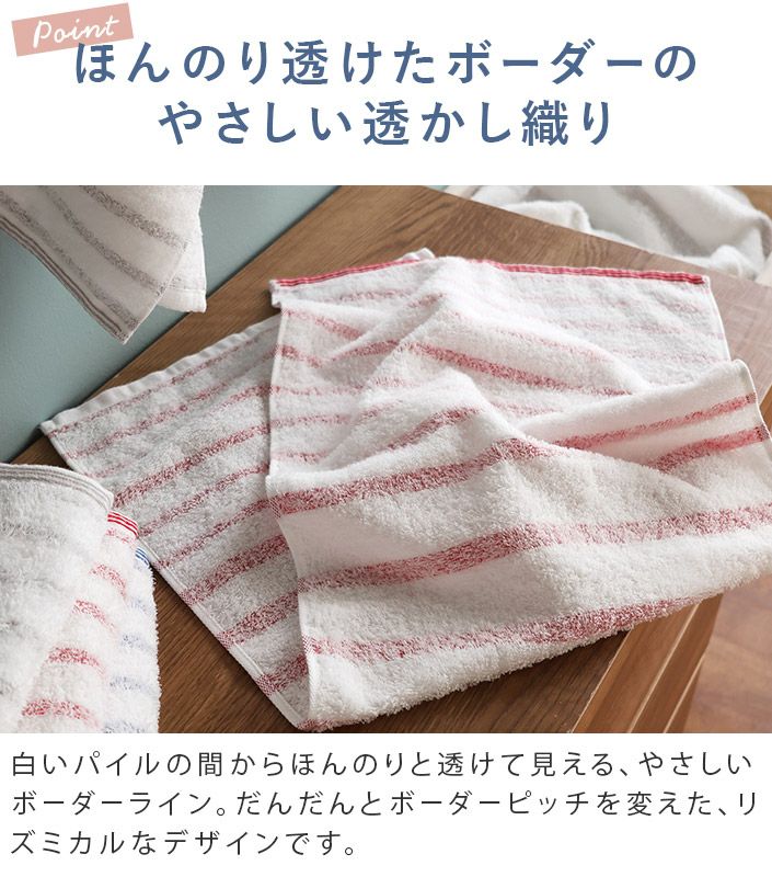 タオル直販店ヒオリエの【今治タオル】ボーダータオルmist ミストタオル。今治タオルは、日本を代表するタオル産地である愛媛県今治で織り上げられた、独自の認定基準に合格した高品質のタオルです。ギフト向けなど、地厚で高級感のある風合いを得意としています。「mist ミスト」は、やや薄手で速乾性・吸水性に優れたデイリー仕様の今治タオルです。バスタオル、フェイスタオルを取り揃えています。上質感のある今治タオルは結婚祝いや出産祝い、お歳暮、お中元などのギフトにもおすすめです。