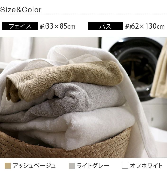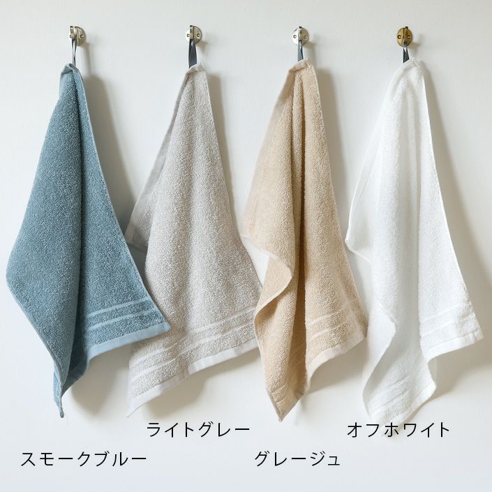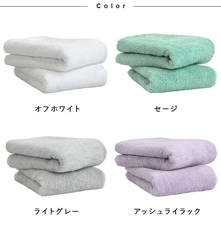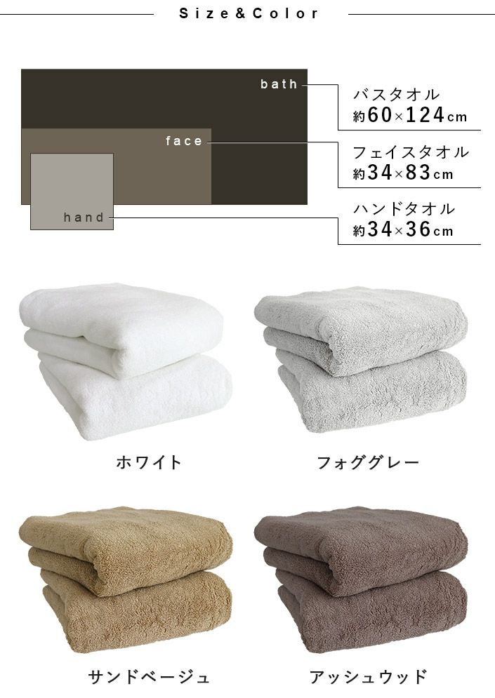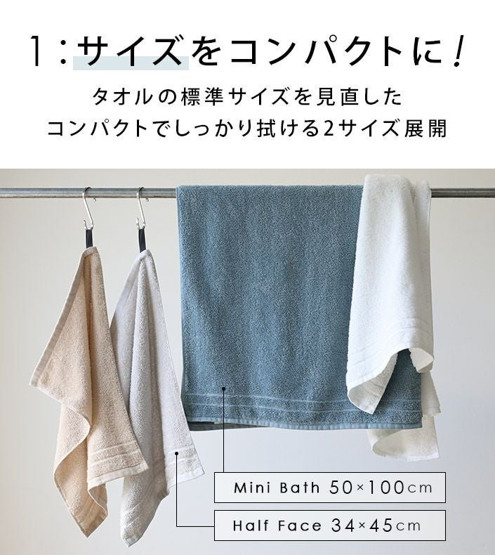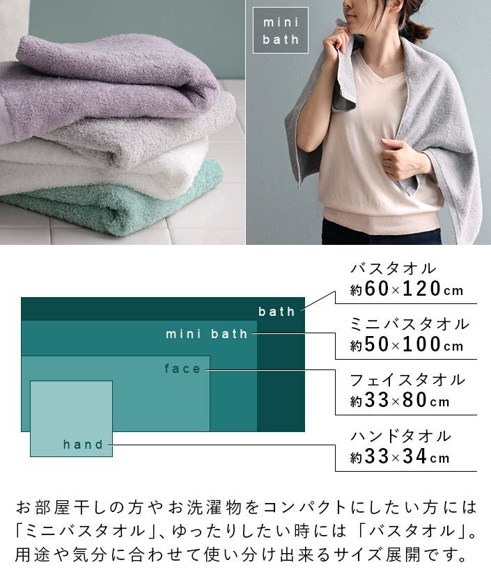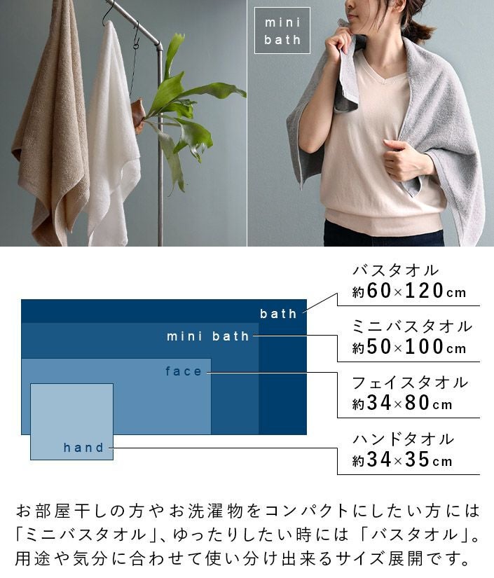 ハンドタオル、フェイスタオル、バスタオル、バスタオル代わりに使えるビッグフェイスタオル&ミニバスタオルの5サイズ展開。