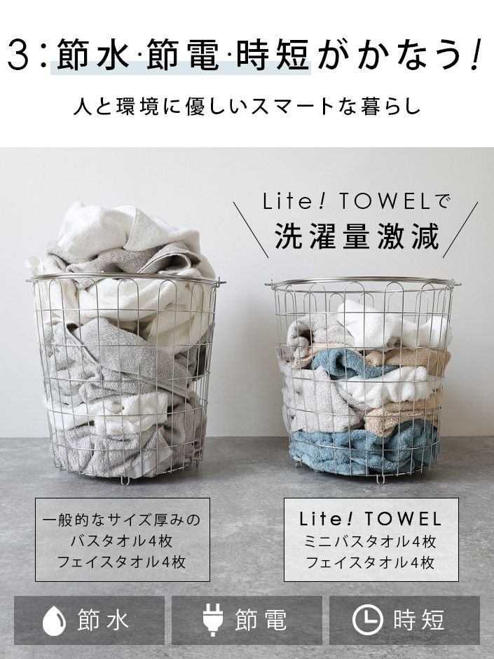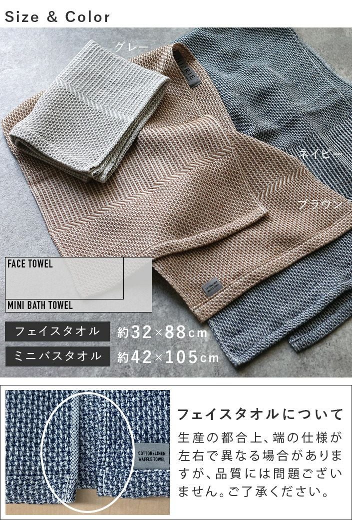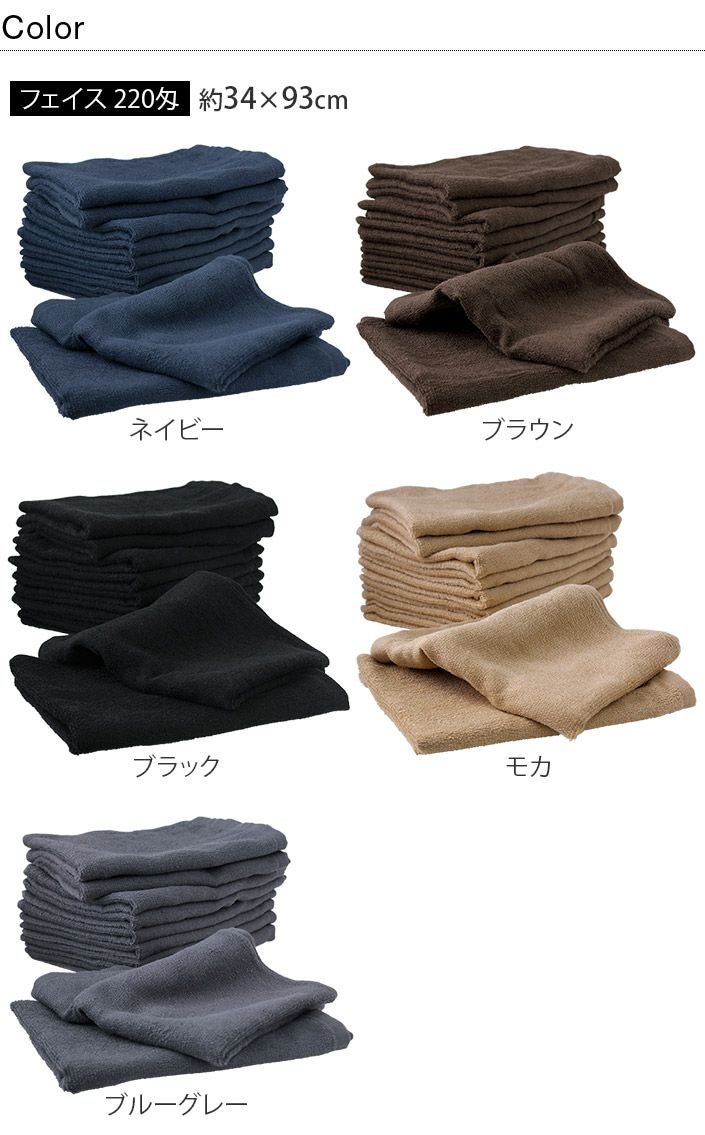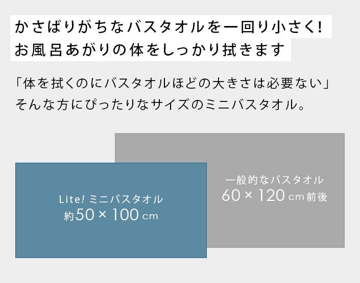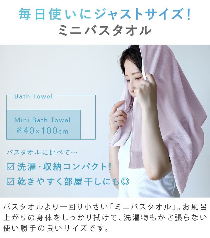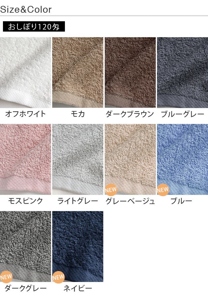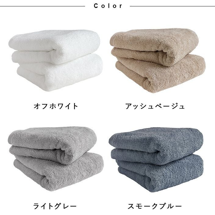 ハンドタオル、フェイスタオル、バスタオル、バスタオル代わりに使えるビッグフェイスタオル&ミニバスタオルの5サイズ展開。