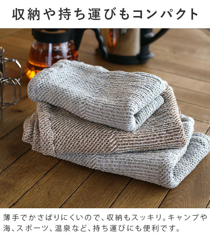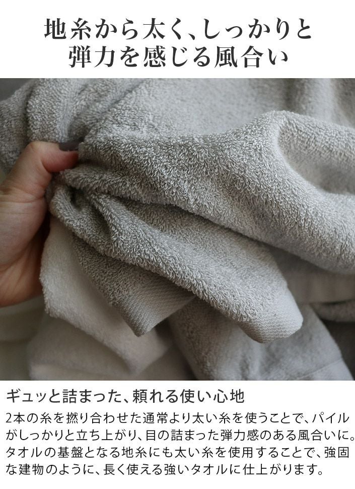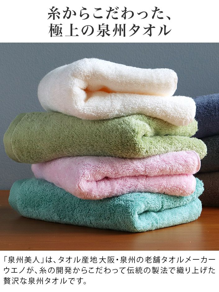 泉州タオルは、ヒオリエの工場もある大阪・泉州で作られ、日本で長く愛されてきたタオルです。天然水を使った「後晒し製法」により、吸水性に優れ、清潔でやわらかな肌触りが特長。毎日の暮らしで安心してお使いいただけます。