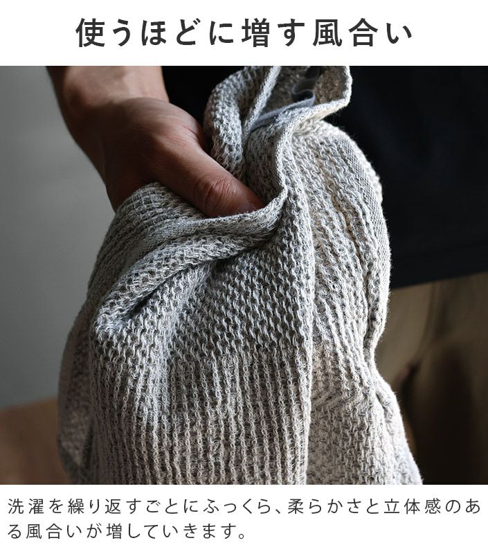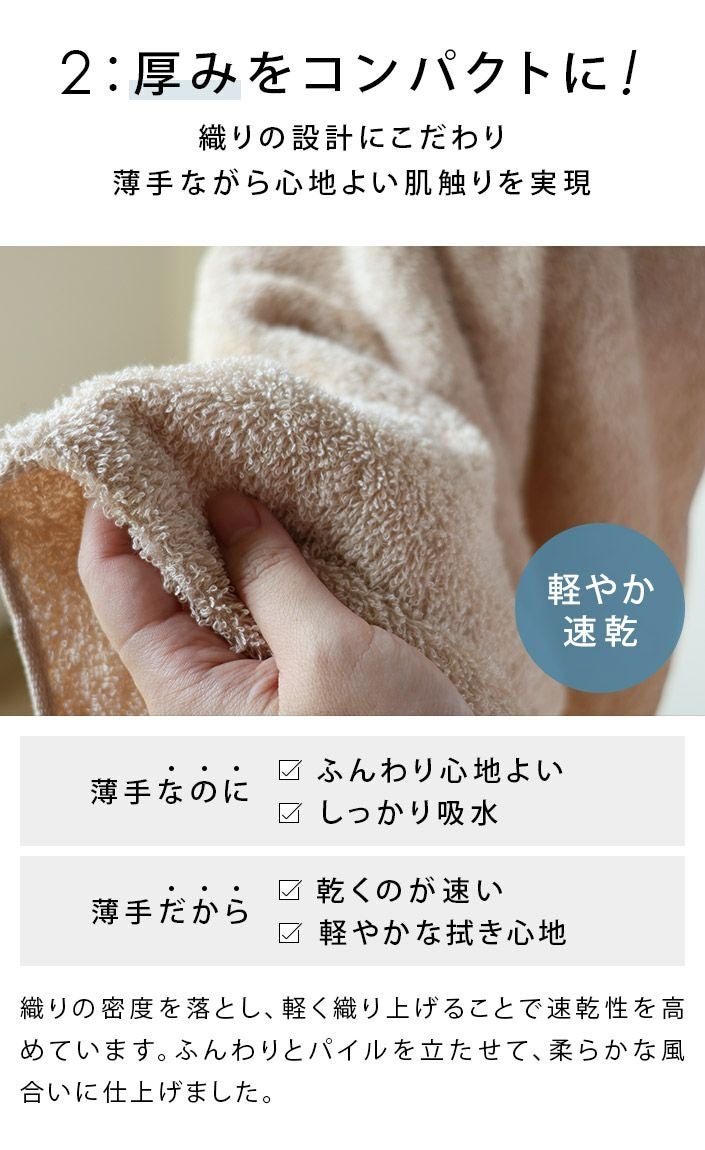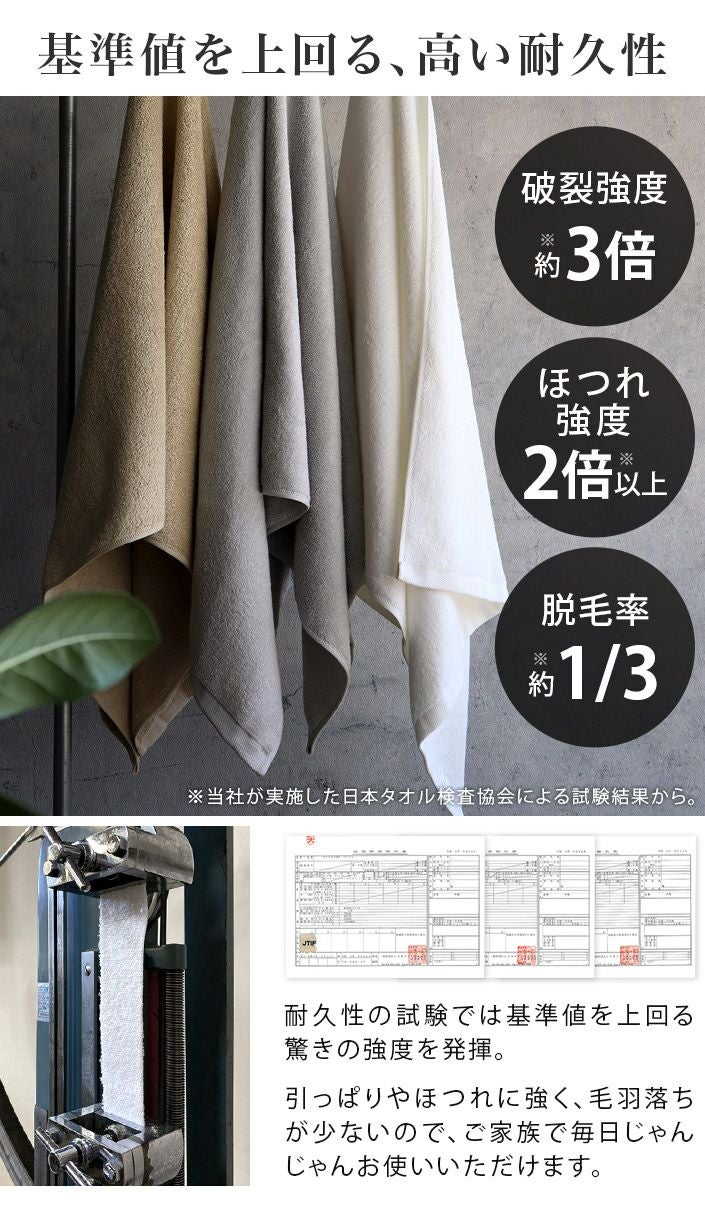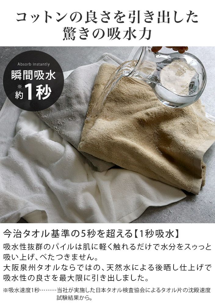 和泉山脈の天然水で晒しを行うことで生まれる、抜群の吸水性と肌なじみの良い柔らかさが特長です。