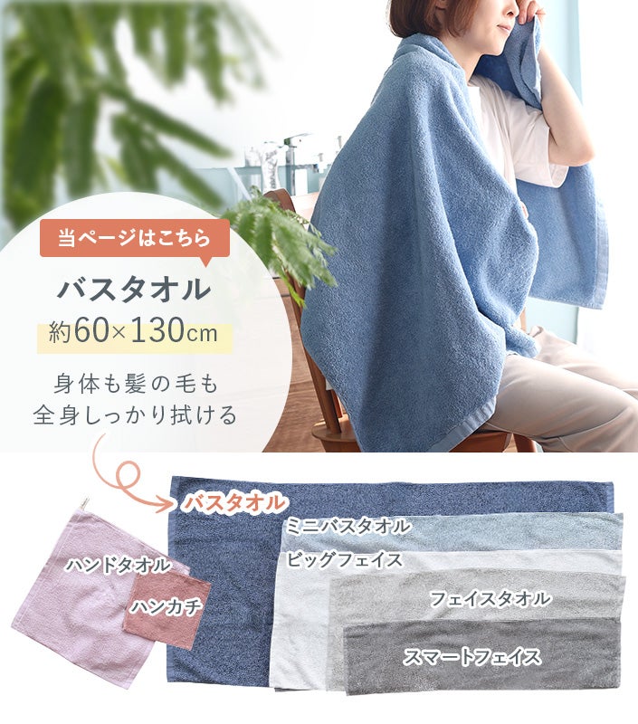 ハンドタオル、フェイスタオル、バスタオル、バスタオル代わりに使えるビッグフェイスタオル&ミニバスタオルの5サイズ展開。