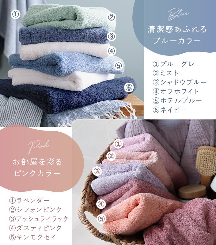 日本を代表するタオル産地である今治タオル・泉州タオルの両方をラインナップしており、用途やお好みに合わせてお選びいただけます。