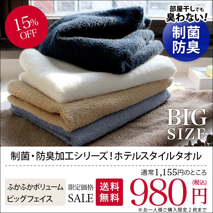 お肌にやさしくお部屋干しでも臭わない衛生的なタオル (送料無料)お試し 【制菌防臭】ホテルスタイルタオル ビッグ フェイスタオル 大きな100cm丈<おひとり様2枚まで>