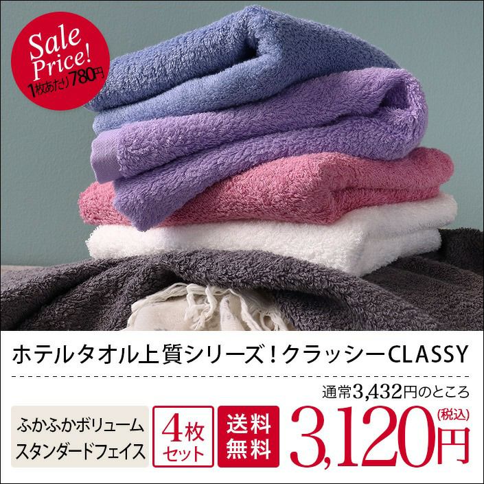 上質綿使用 ワンランク上のホテルスタイルタオルシリーズ (送料無料)<同色4枚セット> ホテルスタイルタオル 高級 CLASSY(クラッシー) スタンダード フェイスタオル