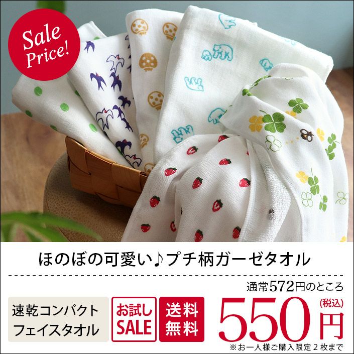 日本製ガーゼタオル フェイスタオル【プチ柄】 (送料無料)お試し ガーゼタオル フェイスタオル プチ柄<おひとり様2枚まで>