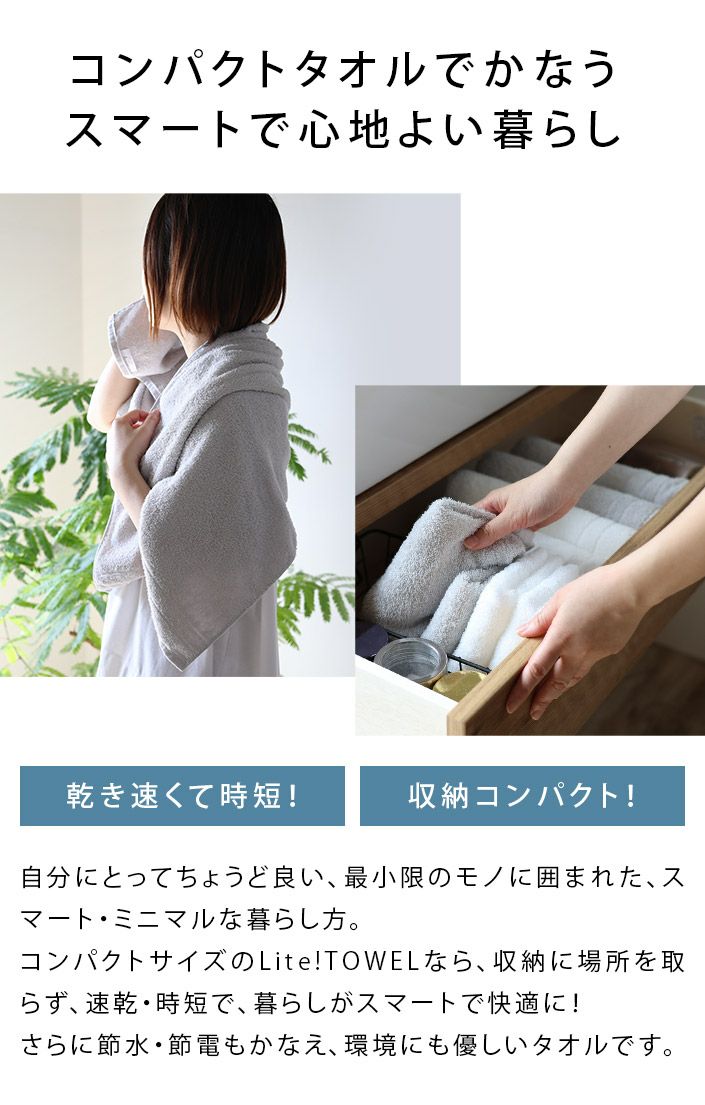 ハンドタオル、フェイスタオル、バスタオル、バスタオル代わりに使えるビッグフェイスタオル&ミニバスタオルの5サイズ展開。