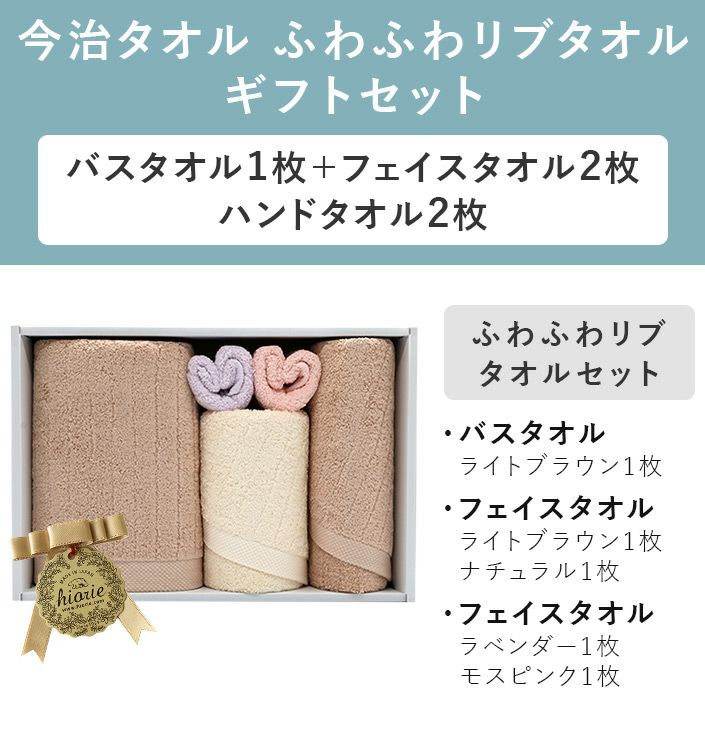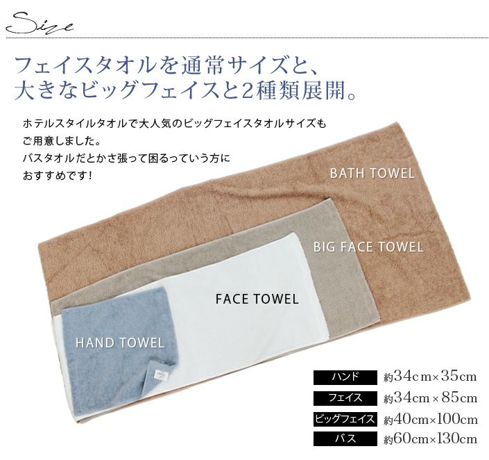 ハンドタオル、フェイスタオル、バスタオル、バスタオル代わりに使えるビッグフェイスタオル&ミニバスタオルの5サイズ展開。