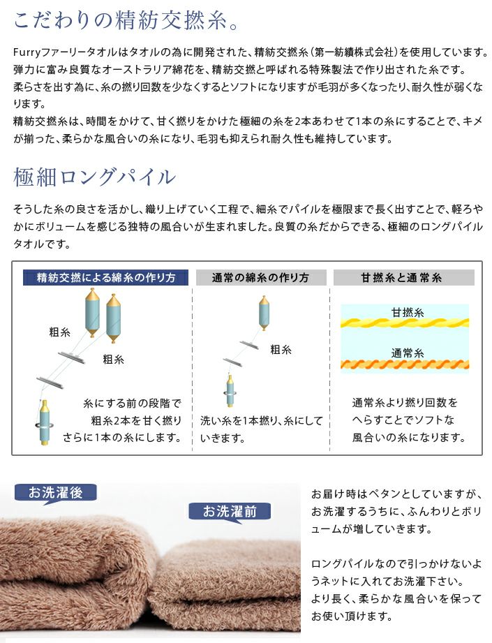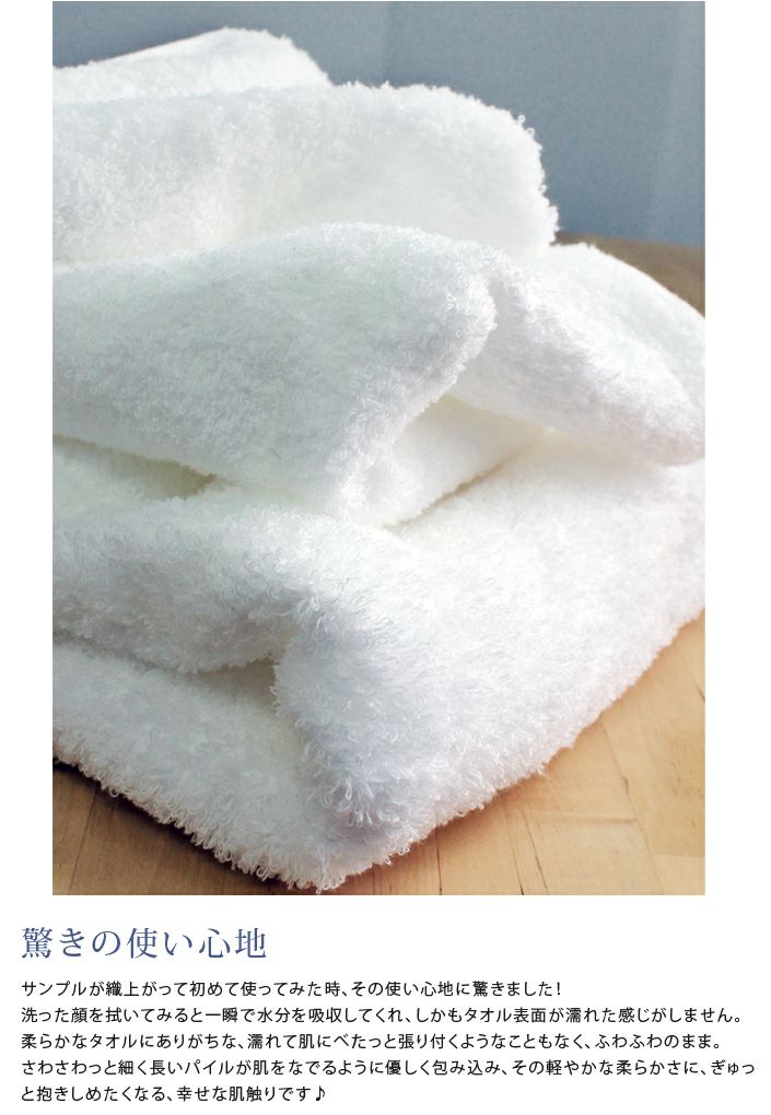 和泉山脈の天然水で晒しを行うことで生まれる、抜群の吸水性と肌なじみの良い柔らかさが特長です。