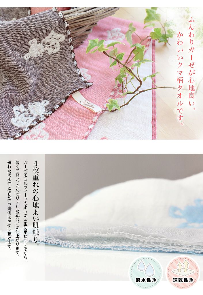 和泉山脈の天然水で晒しを行うことで生まれる、抜群の吸水性と肌なじみの良い柔らかさが特長です。