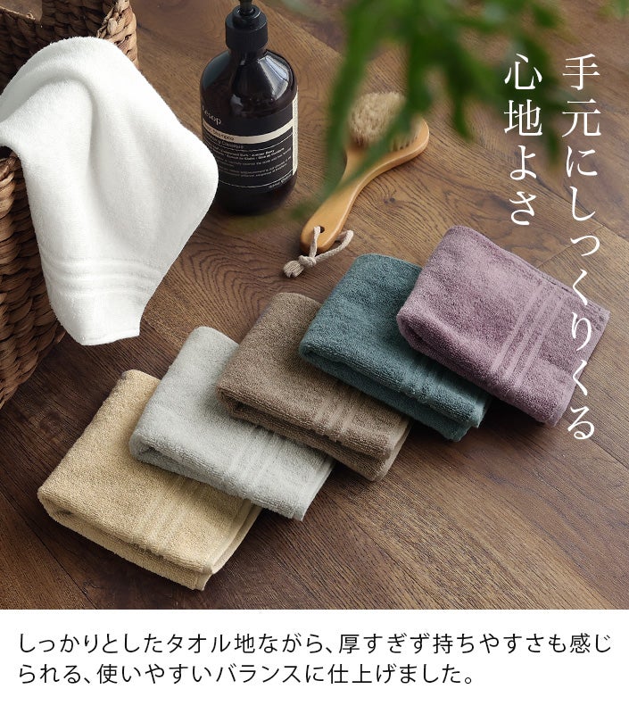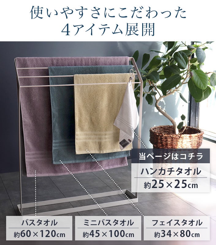 ハンドタオル、フェイスタオル、バスタオル、バスタオル代わりに使えるビッグフェイスタオル&ミニバスタオルの5サイズ展開。