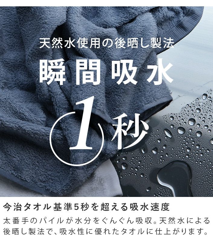 和泉山脈の天然水で晒しを行うことで生まれる、抜群の吸水性と肌なじみの良い柔らかさが特長です。