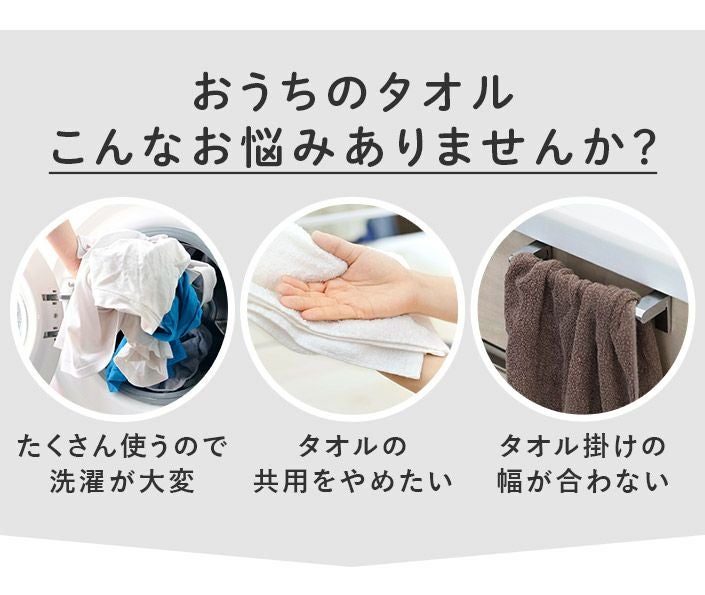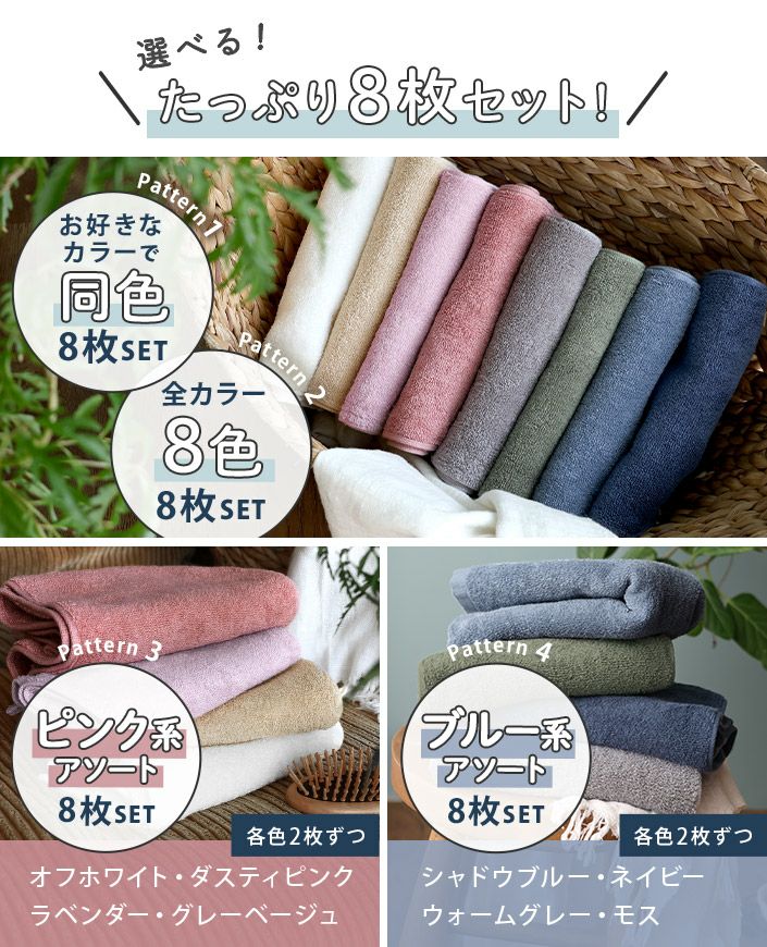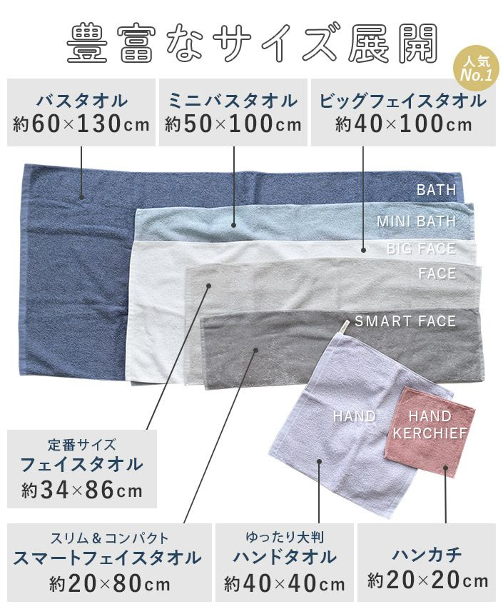 ハンドタオル、フェイスタオル、バスタオル、バスタオル代わりに使えるビッグフェイスタオル&ミニバスタオルの5サイズ展開。
