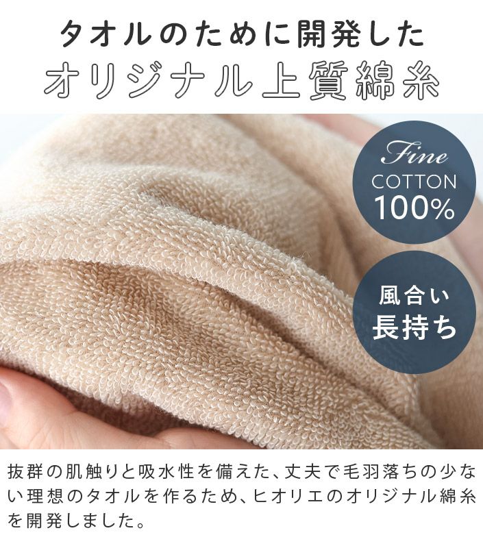 毎日使いできるお値打ちタイプタオルの通販ならタオル直販店ヒオリエ。贅沢な心地良さを目指した、抜群の吸水力と柔らかな風合いが自慢の当店人気No.1シリーズ「ホテルスタイルタオル」、やや薄手で、吸水性、肌触りのよさ、乾きやすさなどにこだわったロングセラータオルの「デイリータオル」をはじめ、大阪・泉佐野の自社工場で織り上げた泉州タオルシリーズが充実。また、シンプルさにこだわった薄手速乾デイリー仕様の今治タオル「今治リバースタオル」など、日本を代表するタオル産地である愛媛県今治で織り上げられた高品質の今治タオルも数多く取り揃えています。