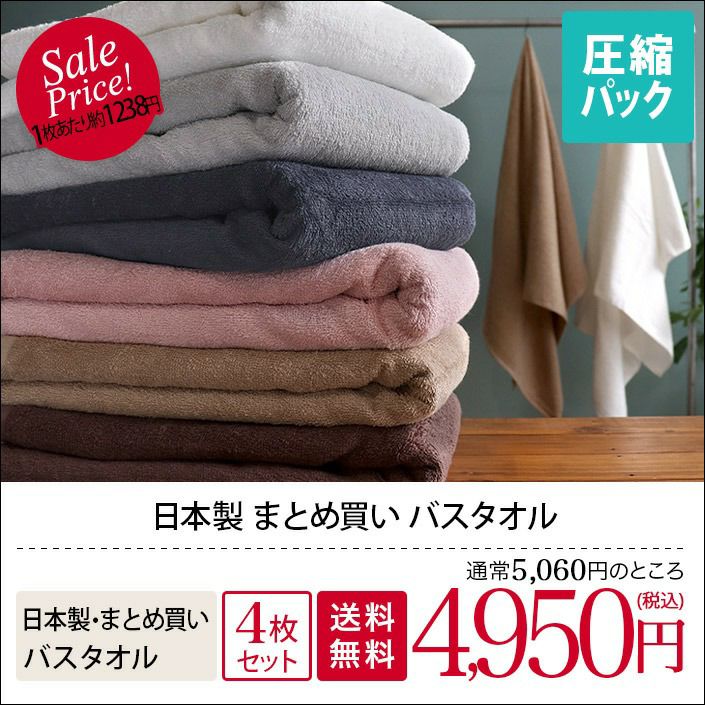 じゃんじゃん使える!丈夫な日本製タオル (送料無料)<4枚セット>(800匁)日本製 まとめ買い バスタオル 【圧縮】