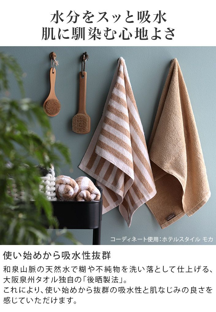 和泉山脈の天然水で晒しを行うことで生まれる、抜群の吸水性と肌なじみの良い柔らかさが特長です。